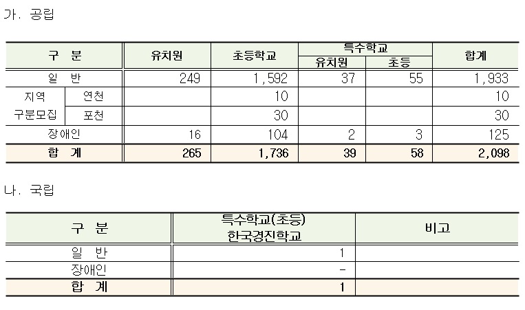 ¼±¹ßÀοøÀº Àü³â´ëºñ 271¸íÀÌ Áõ°¡ÇÑ ÃÑ 2,098¸í(1,827¸í¡æ2,098¸í)À¸·Î À¯Ä¡¿ø ±³»ç 265¸í, ÃʵîÇб³ ±³»ç 1,736¸í(Áö¿ª ±¸ºÐ¸ðÁý 40¸í Æ÷ÇÔ), Ư¼öÇб³ À¯Ä¡¿ø±³»ç 39¸í, Ư¼öÇб³ Ãʵ»ç 58¸íÀ̸ç, Àå¾ÖÀÎ ¼±¹ßÀοø 125¸íÀÌ °¢ ¸ðÁýºÐ¾ß º°·Î Æ÷ÇԵǾî ÀÖ´Ù. ´õºÒ¾î ±¹¸³ Ư¼öÇб³ Ãʵ»ç 1¸í ¿ª½Ã º°µµ·Î ¸ðÁýÇÑ´Ù.