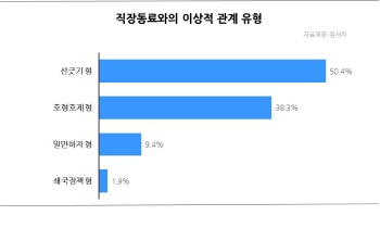 ÀÌ¾î ¡®¼±±ß±âÇü¡¯°ú´Â »ó¹ÝµÈ °¡Á·°°ÀÌ Ä£¹ÐÇÏ°í »çÀûÀ¸·Îµµ ÀÚÁÖ ¿¬¶ôÇÏ´Â ¡®È£ÇüÈ£Á¦Çü¡¯ÀÌ 38.3%·Î ÀÌ»óÀûÀÎ µ¿·á°ü°è·Î ²ÅÇû´Ù. ´ÙÀ½À¸·Î ¾÷¹«ÀûÀÎ ´ëÈ ¸»°í´Â ±³·ù°¡ °ÅÀÇ ¾ø´Â ¡®Àϸ¸ÇÏÀÚÇü¡¯ÀÌ 9.4%·Î µÚ¸¦ À̾úÀ¸¸ç, öÀúÈ÷ µ¿·áµé°úÀÇ °ü°è¸¦ ¾ïÁ¦ÇÏ´Â ¡®¼â±¹Á¤Ã¥Çü¡¯Àº 1.9%¿¡ ±×ÃÆ´Ù.