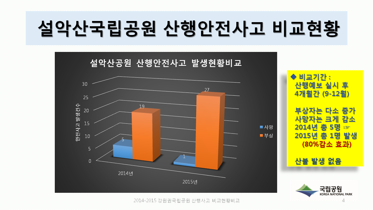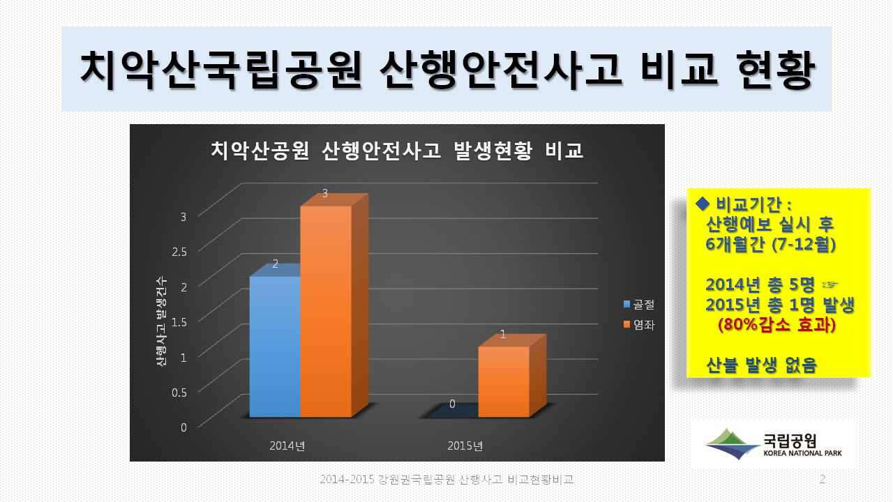 Ä¡¾Ç»ê±¹¸³°ø¿øÀÇ °æ¿ì Àü³â °°Àº ±â°£°ú ºñ±³ÇØ 2014³â °ñÀý 2¸í, ¿°Á 1¸í ¹ß»ý¿¡¼ Áö³ÇØ ¿°Á 1¸íÀ¸·Î 80%°¡ °¨¼ÒÇß°í ¿À´ë»êÀº Àü³â¿¡ Å»Áø, ¿°ÁÂ, °ñÀý µî 15¸í¿¡¼ Áö³ÇØ¿¡´Â 10¸íÀÌ ¹ß»ýÇØ 33%°¡ ÁÙ¾ú´Ù. ¶ÇÇÑ ¿ì¸®³ª¶ó ±¹¹ÎÀÌ °¡Àå ¸¹ÀÌ Ã£´Â ¼³¾Ç»êÀÇ °æ¿ì ºÎ»óÀÚ ¼ö´Â 19¸í¿¡¼ 27¸íÀ¸·Î ´Ù¼Ò Áõ°¡ÇßÀ¸³ª »ç¸ÁÀÚ´Â 2014³â 5¸í¿¡¼ Áö³ÇØ 1¸íÀ¸·Î 80%°¡ °¨¼ÒÇÑ °ÍÀ¸·Î ³ªÅ¸³µ´Ù. ƯÈ÷ ÀÔ»êÀÚÀÇ ½ÇÈ µîÀ¸·Î ¿¹³â¿¡ Àæ¾Ò´ø »êºÒÀÌ Áö³ÇØ »êÇ࿹º¸ ÀÌÈÄ ´Ü ÇÑ °Çµµ ¹ß»ýÇÏÁö ¾ÊÀº °Íµµ Å« ¼º°ú·Î Æò°¡µÈ´Ù.