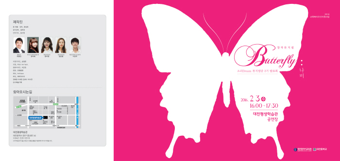 ¹ßǥȸ ÁÖÁ¦´Â ¡®Butterfly(³ªºñ)¡¯·Î½á ¾Ë¿¡¼ ¼ºÃæÀÌ µÇ±â±îÁö ¾î·Á¿î °úÁ¤À» °ÅÃÄ ÇÏ´ÃÀ» ³ª´Â ³ªºñó·³ ¾î·Á¿î ȯ°æ°ú ½Ã·Ã ¼Ó¿¡¼µµ Ä£±¸ÀÇ ¼ÒÁßÇÔ°ú ÀÚ½ÅÀÇ Á¤Ã¼¼ºÀ» ã¾Æ°¡´Â °úÁ¤À» ±×¸° ÀÛǰÀÌ´Ù. À̹ø °ø¿¬Àº ´ëȸ¦ ³ë·¡ Çü½ÄÀ¸·Î ÁøÇàÇÏ´Â Song-Through ¹ÂÁöÄ÷ΠÆîÃÄÁö´Âµ¥ Sing Sing, Love me tender µî ¸í°îµé°ú ÇÔ²² Èï°Ü¿î ºÐÀ§±â¸¦ ´À³¥ ¼ö ÀÖÀ» °ÍÀ¸·Î ±â´ëµÈ´Ù.